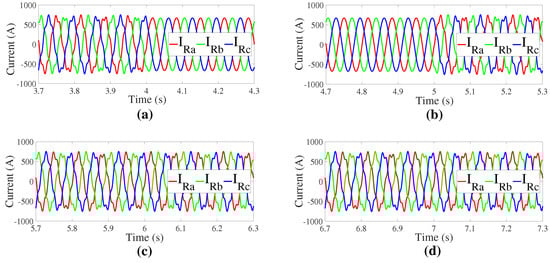 Evolution of the rotor currents (A) when changing from: (a) regular control strategy (no compensation to address the voltage imbalance) to Objective I; (b) Objective I to Objective II; (c) Objective II to Objective III; and (d) Objective III to Objective IV.