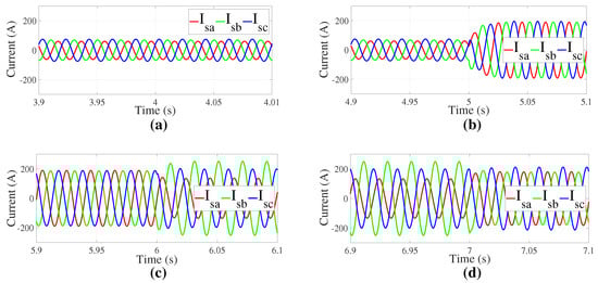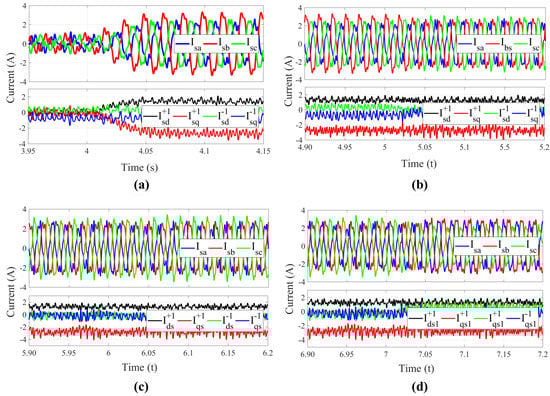 Evolution of the stator currents (A) when changing from: (a) regular control strategy (no compensation to address the voltage imbalance) to Objective I; (b) Objective I to Objective II; (c) Objective II to Objective III; and (d) Objective III to Objective IV.