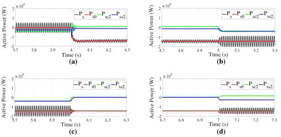 Evolution of the active power (W) when changing from: (a) regular control strategy (no compensation to address the voltage imbalance) to Objective I; (b) Objective I to Objective II; (c) Objective II to Objective III; and (d) Objective III to Objective IV.