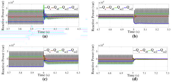 Evolution of the reactive power (var) when changing from: (a) regular control strategy (no compensation to address the voltage imbalance) to Objective I; (b) Objective I to Objective II; (c) Objective II to Objective III; and (d) Objective III to Objective IV.