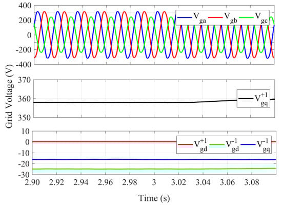 Following the same sequence of simulation tests, the unbalanced grid voltage is shown in Figure 8. The voltage sag considered was the same as in the simulation results, where the residual voltage on phase c was 70% of the pre-fault condition. Figure 8 specifically shows the voltage components in the positive and negative SRF.