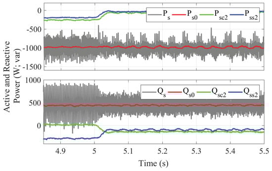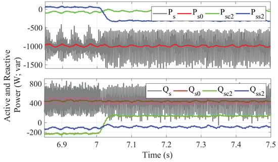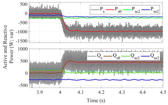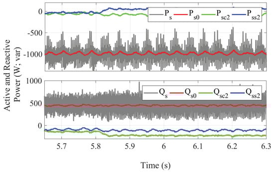 At s (Figure 13), Objective IV takes place, which, similar to Objective III, reduces oscillations but does not completely eliminate them. A slight reduction in the amplitudes of the oscillating components of the reactive power is observed: Qsc2 goes from −230 var to 134 var and Qss2 changes from −117 var to −92 var.