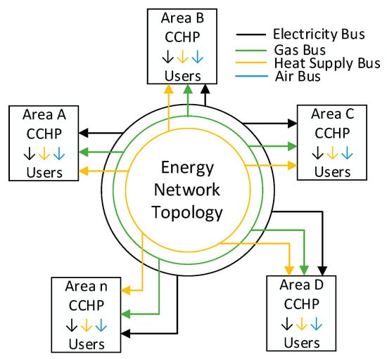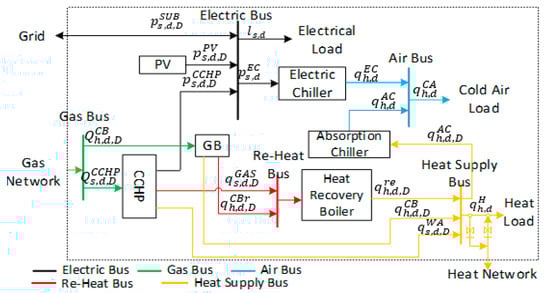 - A 4 MW PV generation system at least is built in each district, a CCHP is considered, and electricity can be purchased from the external power grid when the outputs of the CCHP and the PV are insufficient.