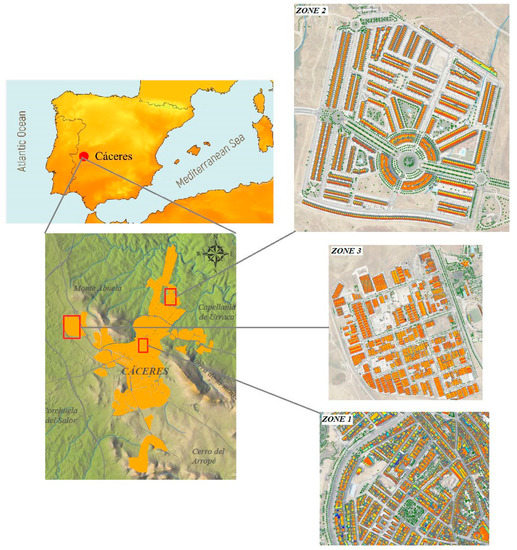 The working area is Cáceres, Spain, a medium-sized city with a mixed urban distribution and a population of approximately 100,000 (Figure 1). This city, which spans an area of 23 km2, was declared a World Heritage City by UNESCO in 1986.