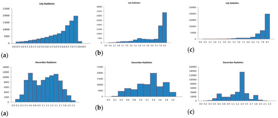 Histograms representing the radiation values in July and December in (a) zone 1, (b) zone 2, and (c) zone 3.