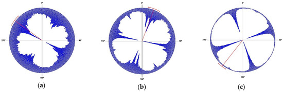 Circular statistics or directional statistics address angular data, axes, or vectors and enable an analysis of orientations in two dimensions. Circular statistics are applied in a variety of disciplines, such as biology [32], meteorology (wind analysis) [33], geography [34], remote sensing [35] and cartography [36], to name a few. The analysis of angular data requires special methods because directional data are different from linear data. For example, the origin of circular data is an arbitrary direction (e.g., the X axis or north), and operations on circular data are performed within the interval of 0°–360°. Moreover, the relationships among circular data are not the same as those among linear data. For example, a value of 30 is greater than a value of 10, but 30° is not greater than 10° when considering that it represents cyclical information [37]. Comprehensive works have addressed circular data [38,39,40].