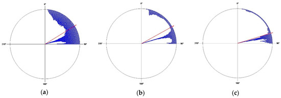 Raw orientation data in (a) zone 1, (b) zone 2, and (c) zone 3. The mean azimuth is plotted in red.