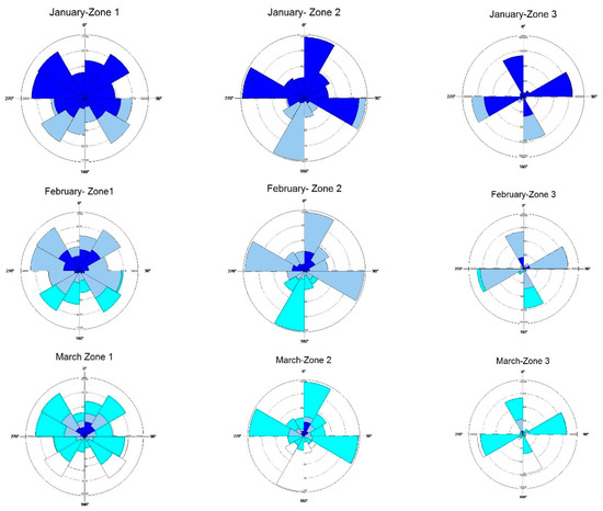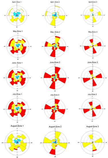 The joint distribution of the circular and linear data is provided in a two-variable circular histogram graphic. This graphic consists of a histogram wrapped around a circle, in which each wedge-shaped section of the histogram depicts the number of observations (radiation values) falling within that portion of the range. In this graph, each wedge spans 30° (a customized parameter) of the total circular range, and the length of each wedge represents the number of observations falling within that range. Every wedge divides the radiation variable into frequency classes represented by a color ramp. Blue colors represent low radiation values, whereas red colors imply a higher level of received radiation. Figure 6 shows 36 two-variable circular histogram graphics corresponding to a graph for each month and area. These graphs enabled a comparison of not only the differences in the orientations of the gables according to each area but also the distributions of the radiation and the variations of this parameter throughout the year.