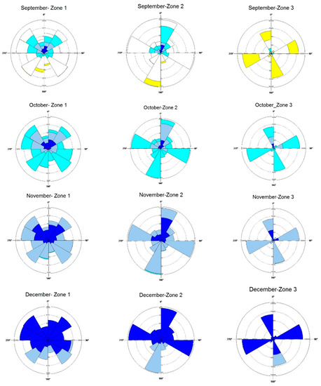 The circular graphics representing the slope data of the rooftops are related to the typologies of the buildings in the three different zones. According to the two-variable circular histogram graphics, the roofs oriented towards the north received less radiation than those oriented towards the south, especially from September to March. In contrast, from May to July, the Sun was higher, and the radiation received by the rooftops oriented in both directions were relatively similar. These results confirm those obtained by [46], who determined that the solar radiation varies with the geographic latitude, that the shortest period faces the direct sunshine, and that the solar radiation falling on the north-facing vertical plane is the lowest. More specifically, other studies conducted at similar geographic latitudes, such as [47], confirmed that the optimal building rooftop and façade orientation for the installation of a PV system faces the south when implementing solar urban planning.