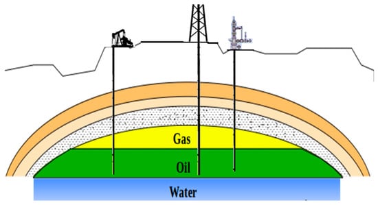 Petroleum, natural gas, and condensates are naturally occurring substances which are discovered within the Earth’s crust, are thought to originate from decomposed animal and plant matter. Scientists believe the plants and animals died in the distant past, and were gradually buried by thick layers of sediments. Over a long period of time, and with pressure and temperature, the organic materials were transformed into the oil and gas which are found today. When oil and gas are removed from the ground they are sent to refineries by pipelines. Then, many products from these materials, which potentially contain several chemicals called hydrocarbons, can be obtained including energy for power, motor oil, gasoline for cars, diesel fuel for trucks and trains, hi-octane fuels for planes, heating oil for houses etc. Several other materials also come from petroleum such as plastics, asphalt, grease, lubricating oil, materials for clothes, chemicals for everyday use, paints etc. Since oil has natural gas in it, when oil is produced often some gas is produced with the oil if natural gas is in the solution. The majority of oil is trapped in the tiny pore spaces between grains of rock or sand. Oil and gas are discovered in natural traps which consist of domes or faults within the earth. Impermeable rock above the trap that fluid cannot pass through it stops the oil and gas from move up to the surface. Without traps, the oil and gas could migrate all the way to the surface and evaporate. Figure 1 shows an example of an oil reservoir with a gas cap.