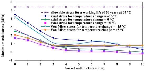 The finite element results for maximum values of Von Mises and axial stresses under the simultaneous effects of the soil column weight, pipe internal pressure, vehicle wheel load and temperature variations of +5 °C, −15 °C and 0 °C (no variation) in the buried pipe and its socket are calculated and presented in Table 2.The maximum axial stress and the maximum Von Mises stress values in the wall of buried socket joint of the gas distribution pipe under the simultaneous effect of mechanical loads including soil load, internal pressure, vehicle wheel load and thermal loads in the form of maximum temperature drop of 15 °C and increase of 5 °C are calculated and plotted in Figure 4. For Figure 4, the coordinate system is selected so that the origin of the horizontal axes represents the socket internal surface and the stress variations are plotted from the origin to the socket crown. As expected, the upper curves pertain to the temperature decrease. Additionally, the dashed curve indicates the allowable stress value for design temperature of 35 °C based on a 50-year life expectancy for the pipe and socket material. Additionally the Von Mises stresses variations are plotted from the socket internal surface to its crown.