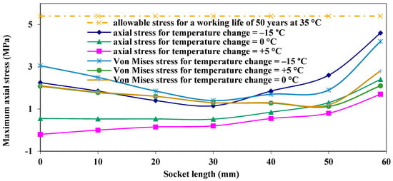 Maximum axial and Von Mises stress variations along the socket length (the simultaneous effect of soil load, internal pressure, vehicle wheel load and temperature variations).