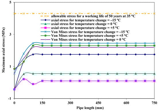 Figure 5 shows the simultaneous effect of the aforementioned mechanical and thermal loads on the maximum axial and the maximum Von Mises stresses along the socket length of the buried polyethylene gas pipe. The origin of the horizontal axis is supposed to be the socket center. As the result of the geometry and loading symmetry, only the stress values of half of the socket are presented. Similarly, the dashed line is for the allowable stress values for the material of PE100. Additionally, maximum axial stress variations and maximum Von Mises stress variations along the half of pipe length under the simultaneous effect of soil load, internal pressure, and vehicle wheel load and temperature variations are calculated and plotted as Figure 6.