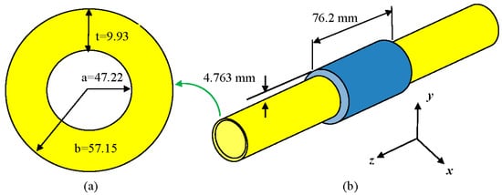 Polyethylene pipe and patch arrangement. (a) Two dimensional view (dimensions in mm) of the cross section of the medium density polyethylene gas pipe. (b) Three dimensional model of patch repaired pipe showing patch dimensions [8,9,10,11,12,41].