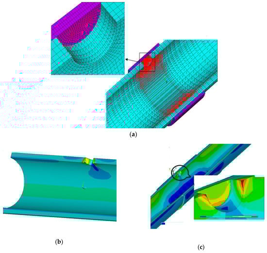 Figure 8. Finite element modeling of sectioned pipe and socket to show Von Mises stress distribution. (a) Mesh generation and the application of internal pressure. (b) Stress distribution in PE pipe with 1″ diameter circular hole. (c) Stress distribution in PE pipe and patch.