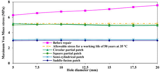 The plotted curves in Figure 9 show the variation of maximum Von Mises stress in the defected patch repaired PE pipe for each kind of patch arrangement and also in unrepaired defected pipe, versus various hole diameters in the pipe. Additionally, the reduction percentage in maximum stress values resulted from the application of a special patch repair are shown and compared in Table 6.