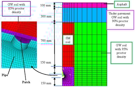 In this section we continue to investigate the studies in [9,10] with more details and under more critical loading conditions by superimposing various thermal loads in the form of temperature variations and the mechanical loads including surcharge loads, soil column weight, soil-pipe interaction and inside pressure of 4 bar applied to the repaired defected polyethylene pipe and its patch. The trench dimensions and pipe surroundings are selected based on Figure 10. Also, soil grades which are selected based on ASTM standards along with model dimensions are depicted on the computer simulation model in Figure 10.