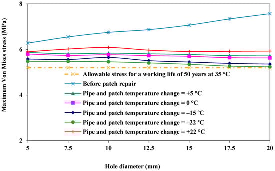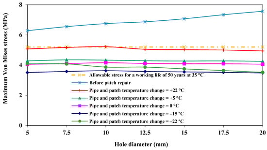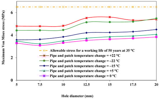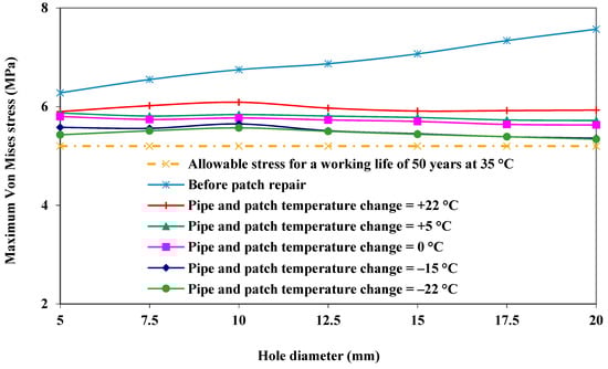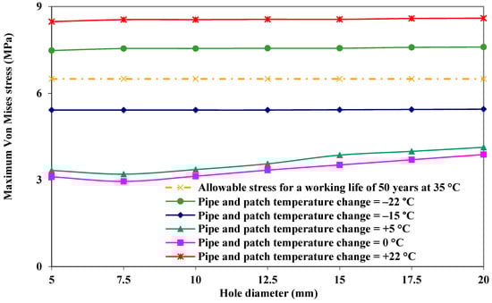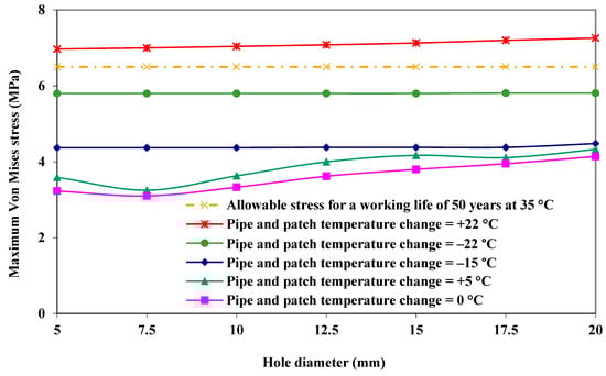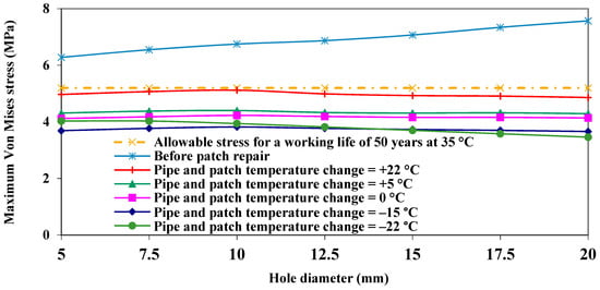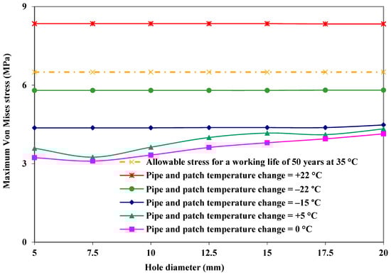 Additionally, the maximum values of Von Mises stresses in the square partial patch arrangement versus pipe circular hole diameters under simultaneous effects of aforementioned mechanical loads and various thermal loads in the form of daily and seasonal temperature variations are presented in Figure 16. As can be implied, the temperature variations have a significant effect on the variation of the maximum Von Mises stresses in the square partial patch. The lowest curve on Figure 16 belongs to the situation where no temperature change is imposed to the pipe and patch at the burial depth under the ground that means it is the case with the minimum valves of the induced maximum Von Mises stresses. Additionally, uppermost curve fits the data obtained for the maximum temperature change (+22 °C temperature increase, based on seasonal variations), which shows the case with highest values of induced maximum Von Mises stresses among others. It is clear that for low temperature changes, including 0 °C and +5 °C, the maximum Von Mises stresses in the patch increases for larger hole diameters. For higher temperature changes including −15 °C, −22 °C, and +22 °C the results will remain approximately constant even by increasing hole diameter. For the square partial PE100 patch material it can be implied that higher temperature changes (both temperature increase and temperature decrease) impose higher maximum Von Mises stresses. The curves showing the data of patch stress results are below the allowable stress of the patch material except for the case of +22 °C temperature increase.