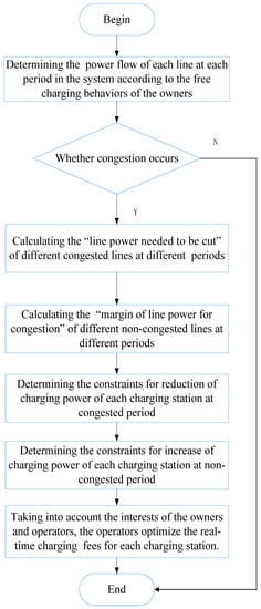 With the large-scale introduction of electric vehicles into the network, it has been found that the peak period of free charging loads coincides with the peak period of conventional loads, so the load curve appears “peak to peak” [15], which causes congestion in the distribution network. By adjusting the charging fees [16] or using the optimal power flow method to determine the congestion price [17], operators can adjust and coordinate electric vehicle loads based on charging fees or congestion price. Thus, the load of electric vehicles at congested periods can be transferred to non-congested periods. In this way, congestion problems in the distribution network can be solved and owners’ charging cost can be reduced.