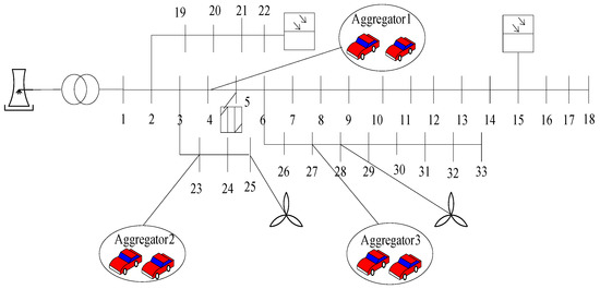 The modified IEEE-33 system [23] with electric vehicle aggregators and distributed energy resources is shown in Figure 2. The system contains three charging stations, which are located on node 4, node 23 and node 27, respectively. It is assumed that a fixed number of electric vehicles, expressed by the term aggregator, will be charged at each charging station every day in free charging mode. A gas turbine with a capacity of 300 kW is located on node 4, and two wind turbines with installed capacity of 1 MW and 500 kW are located on node 25 and node 28, respectively. A Beta distribution model based on local error [24] is adopted for wind power output. Two photovoltaic power generation units with installed capacity of 500 kW are located on node 15 and node 22. The light intensity meets the Beta distribution [25].