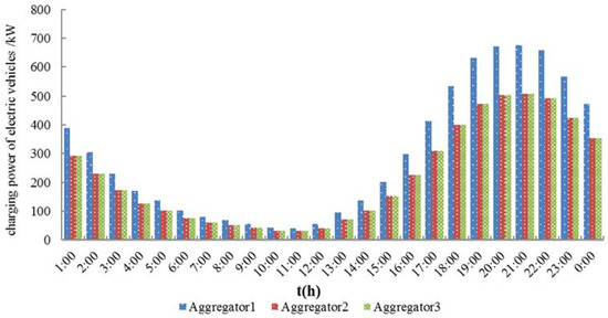 In order to study the impact of large-scale electric vehicles access to the distribution network, the free charging mode is simulated. Monte Carlo simulation is performed by using the known probability density function of the initial charging time of electric vehicles and the probability density function of daily mileage [15]. The distribution results for the charging power of each aggregator is shown in Figure 3.