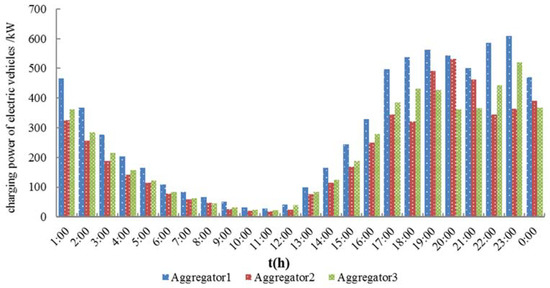 After implementing the real-time charging fees policy, the distribution of charging power of each aggregator is shown in Figure 4. The charging power of each charging station at each period before and after the adjustment for charging fees is shown in Table A1 and Table A2 in Appendix A.