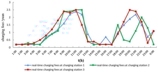 The real-time charging fees for three charging stations after optimization is shown in Figure 7. In the case of free charging mode, the charging cost of the owner is 17,601 yuan. After implementing the real-time charging fees policy, the charging cost is 15,433 yuan, and the owners have a high satisfaction rate of 85%. The congestion problem of the distribution network is solved while taking into account the interests of the owners and the operators.