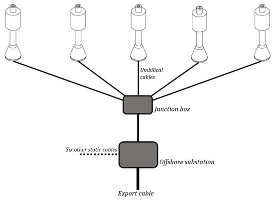 A variety of electrical configurations and array layouts are considered in the techno-economic model. For the macro-economic assessment a single array layout and electrical configuration was considered. For the farm layout, effectively 2 rows of devices is considered, with the distance between devices set as just over 13 device diameters. For the electrical configuration, a star array was chosen as it provided a lower LCOE than a string configuration, and has advantages in terms of redundancy of the system. In this configuration, each device has its own umbilical cable, and ‘stars’ of devices are grouped prior to connection to the offshore substation. This is illustrated in Figure 2, whereby one star of five devices is depicted. Six other static cables connect the remaining 30 devices to the offshore substation.