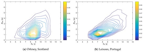Contours describing the relative abundance of significant wave height, , and energy period, , for the two sites are shown in Figure 3, based on data from [26,27]. This demonstrates the differing nature of the two sites in terms of spread of likely sea state conditions. The mean values, however, are comparable, with the Leixoes site having mean values of and of 2.0 m and 8.6 s, and EMEC 1.8 m and 8.8 s.