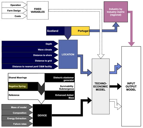 The techno-economic–IO model considers a wide variety of parameters, enabling the assessment of various locations, device types (and associated failure rates), farm layouts, materials, vessels and other variables. The details of the logistic model used to compute the techno-economic analysis can be found in [28,29], with techno-economic model outputs for the WETFEET project in [30]. Detailed CAPEX and OPEX entries are then passed to the IO model, along with other key variables, such as location, which directly influence the modelling work. The key inputs and considerations in the model is depicted in Figure 4. Outputs of the IO model for all of the breakthrough cases can be found in [31].