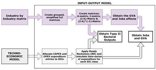 The outputs of the techno-economic model, along with the IxI matrices are used as inputs to the IO model. The procedure used to carry out the IO modelling work is as follows: