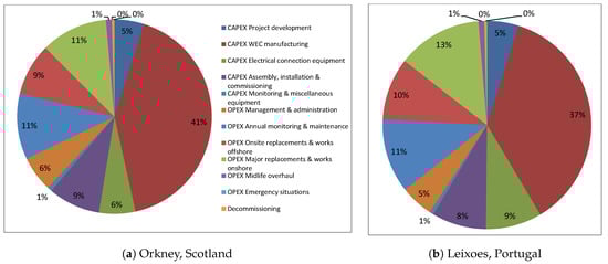 The LCOE computed for the OWC farms installed in EMEC, Scotland and Leixoes, Portugal are 105 c€/kWh and 130 c€/kWh respectively, with the corresponding breakdown of the LCOE into major cost centers is depicted in Figure 6a,b. The values for LCOE are notably higher than conventional electricity generation, which as detailed in [35] tend to range between 5 c€/kWh and 20 c€/kWh. It is worth noting, however, that there is no learning rate assumed in the LCOE calculation and the farm is relatively small and hence does not take advantage of economies of scale. It is also true (and evident in Figure 6) that there is high ratio of manufacturing cost, and material, to the rated power of the OWC. This suggests that the size of the OWC device may be sub-optimal, and a larger device may represent a more material efficient machine. This aspect, however, is not the focus of the presented study.