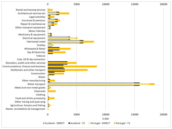The type II outputs for the 29 aggregated sectors is shown here for the projects deployed in Scotland and Portugal. Results are shown relative to the direct demand associated with the sectors for the prospective projects. This comparison is concisely presented in Figure 7, enabling comparisons to be made between type II outputs and demand, along with the relative values for the two locations studied.