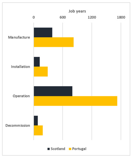 The total jobs associated with the four project phases are presented in Figure 8 for both Scotland and Portugal. In this figure the job years are presented, which is the sum over the project phase of the total (type II) number of jobs supported in each year, across all sectors. Peak employment occurs during the combined installation and manufacturing phase, where over 420 jobs are supported each year for Portugal and over 190 for Scotland. This large difference is owed to the larger CAPEX required for the Portugese development, due to the additional mooring and cabling requirements for the Leixoes site compared with EMEC. Similarly, the increase in jobs supported for the operational, installation and decommissioning phase is largely due to the cost associated with increased water transport for O&M tasks and the associated multiplier effects through the economies.