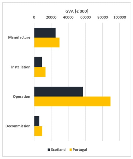 The total GVA associated with each of the project phases is presented in Figure 9. Peak annual GVA exceeds €16.5 m for the Portugal development, and €12.8 m for the Scotland equivelent. As expected there is a strong correlation between number of jobs and GVA for each project phase. However, it is evident that there is a larger proportion of total GVA associated with the operational phase, than the proportion of total jobs attributed to this phase. This is likely due to the nature of employment associated with the two phases; suggesting that a greater number of personnel is required per output of manufacture work than operations, which may be attributed to the large proportion of costs associated with vessel hire.