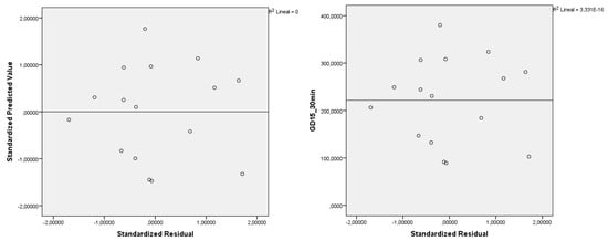 In order to check homoscedasticity, the linear determination coefficient (R2) between residuals and predictions (R2 = 0) and between residuals and the independent variable (R2 = 3.33 × 10−16) is calculated. As shown in Figure 6, these are close to zero.