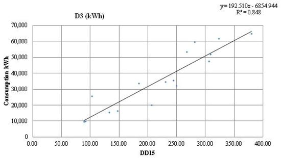 The absolute correlation value between the independent variables was between 0.896 and 0.999, and was positive for the models explained with the grade-day variable on a basis of 15 °C and negative for the mean temperature variables. The determination coefficient was between 0.802 and 0.998, so, accepting a risk error of 5%, the models found a predicted expected consumption with an accuracy probability greater than 80%., Figure 8 shows the linear regression model for building D3 (CTTA), displaying the consumption in kWh of the study period when the district heating was operating, and the straight line of consumption obtained with the explanatory variable.