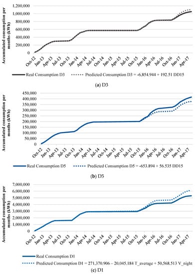 From the baselines of the regression models found and the climatic variables for the 2015–2017 periods, the expected or predicted consumption was obtained and compared with the actual consumption obtained in those periods. Figure 9 shows the results of actual consumption and forecast consumption (dashed line) for the periods following the installation of the district heating in several of the buildings on the Miguel Delibes campus. Building D3 (CTTA), where hardly any variation is observed, building D5 (University Institute of Applied Ophthalmology (IOBA)), where an increase in real consumption is observed with respect to the forecast, and building D1 (Apartments), where energy savings are observed.