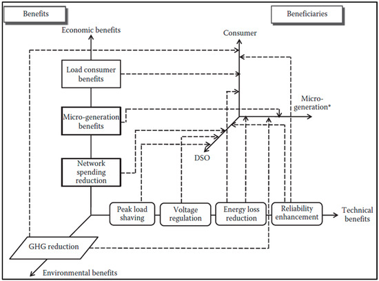 According to [14], microgrids can provide economic, environmental, and technical benefits to the relevant stakeholders, e.g., consumers and Distribution System Operators (DSOs) (shown in Figure 1). Consumers can get cheap electricity either from microgrids or the main grids. DSOs can benefit from the local generation and demand management initiatives to reduce the load on distribution grids at peak periods. Microgenerators can benefit from providing electricity to the microgrids or the main grids. Some governments provide subsidies to the microgenerators for using renewable energy technologies. There are two environmental benefits of the microgrid: the reduction of greenhouse gas emissions and the adoption of more energy-efficient energy supply solutions [16].