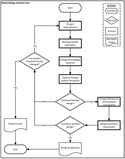 The four process boxes after the start element, the Project requirements, the Demand profile estimation, the Energy technologies selection, and the Optimal energy system simulation, relate to the technical aspects and requirements of the energy system design. With the decision element, is there technically feasible design? After the first four processes the energy system will be designed until it is technically feasible, if possible. When a technically feasible design is simulated, then the value of energy efficiency and demand management is determined in the Energy efficiencies and demand assessment process. Afterwards the energy system design is assessed, in the Design economics assessment process, to determine if it is economically feasible. Along with the latter process, the decision element, is there economically feasible design? This is where it is decided if the energy system design must be redone or a design can be proposed. If no design is feasible, then the related issue is highlighted in the documentation element, Project issues. On the positive side, if a simulated design is feasible then it is presented in the Design proposition documentation element.