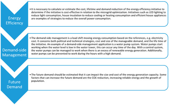 Demand profile estimation considers the energy efficiency, demand management, and the future demand because these three fields can help to reduce the size of the energy system and thereby the Cost of Energy (COE). The result of this process is a demand profile that can be used for microgrid optimization. A demand profile can be estimated based on the type of inhabitants in the remote area, the current energy generation system and the microgrid location. Figure 3 presents the demand profile estimations that needs to be taken into consideration.
