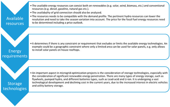 The step of energy technology selection defines appropriate energy technologies adopted in the microgrid optimization. The potential energy technologies to be considered in this step are defined by the available energy resources, such as average solar irradiation, wind speed, hydro availability, etc. The project requirements are assessed to determine if any constraint associated with the framework excludes or limits the use of some technologies. The fraction of the renewable energy generation from the total energy generation determines whether the energy storage needs to be included in the energy system. The cost and size are estimated once the energy technologies are identified. Figure 4 presents the common energy technology selection considerations that need to be addressed.