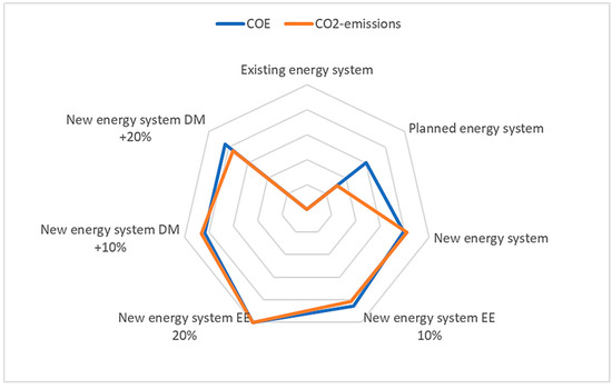 By introducing energy efficiency initiatives, the COE and CO2 emissions can be reduced. Also, the introduction of additional demand management will reduce the COE slightly and the CO2 emissions will increase. This is illustrated in Figure 11, the values are inverted and normalized for better visual comparison. The further away the graph lines are from the middle, the more positive impact.