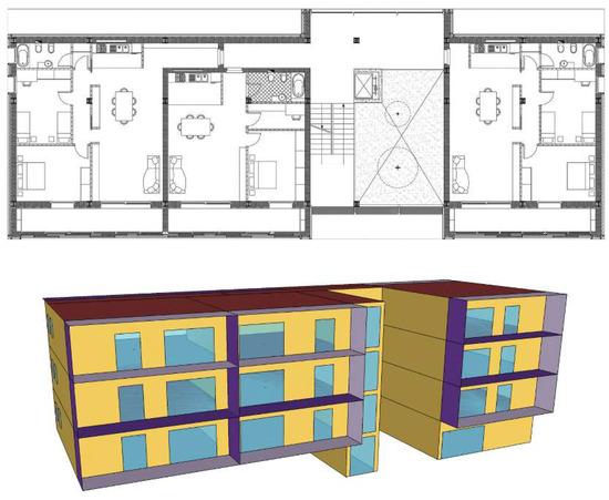 To assess the impact of the input climate database on the annual energy performance computed in a transitory regime, a building was designed representing a normal civil residence in Rome built according to construction standards of the early 2000s [51]. It was a building constructed according to traditional techniques that partially take into account the requirements of energy saving for the building envelope, but with margins of improvement both on the performance of the envelope and on the existing plant. To this end, a building placed on a pilot plan, consisting of three floors with three apartments for each floor, was assumed. The staircase was equipped with a lift, acting as a divider for each floor between an isolated apartment and two apartments side by side. A walkable terrace was hypothesized as a roof of the building. The plan of one floor and the 3D model of the stable interior are shown in Figure 1.