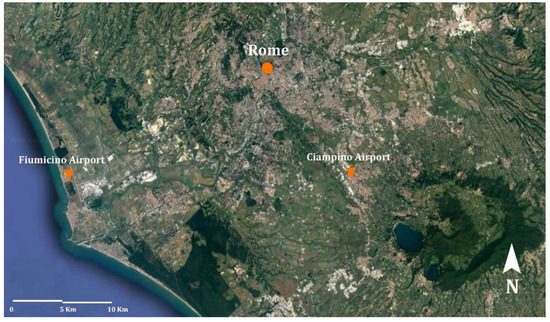 Aerial photo of the Rome metropolitan area and locations of the airports of Fiumicino and Ciampino.