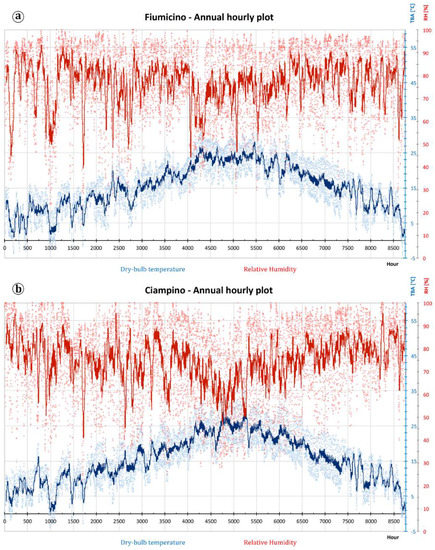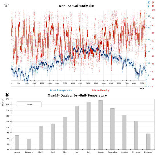 Data on the dry-bulb air temperature (TBA) and relative humidity were analyzed and plotted for the 8760 h of a standard year (Figure 3). Moreover, for the TBA, the monthly averages were computed and are shown on the graph in Figure 4.