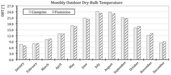 Monthly dry-bulb temperature (TBA (°C)). Data were sourced from climate files provided by the EnergyPlus database for Rome, and correspond to the airports of Fiumicino and Ciampino.