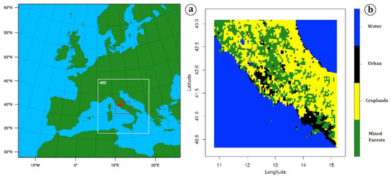 The WRF geographic configuration used for this study consisted of three nested domains covering Europe, Italy, and an area in central Italy, with an increasing resolution from 36 km to 4 km. The geographical areas and the land use of the innermost domain are shown in Figure 5, while the number of cells of each domain, together with the resolution, is shown in Table 4. The vertical grid had 33 levels for all domains, with the lowest one at about 23 m and the top at 50 hPa.