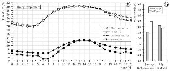 Figure 6 shows the comparison between the results of the WRF runs and the observations provided by two urban weather stations in Rome, for a winter month (January) and a summer month (July). Results confirm that the performances of the model were definitely better for the temperature compared to the wind speed intensity, and that the best performances were in the summer for both variables.