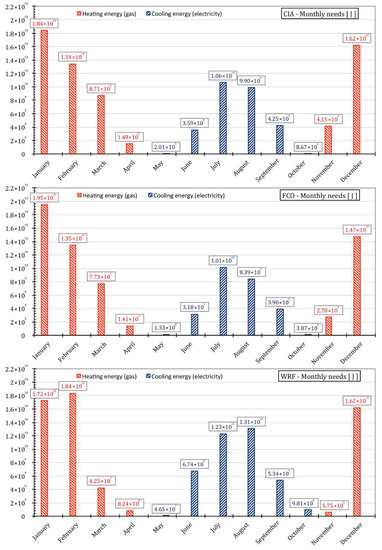 EnergyPlus simulations were performed using the three different climate files available as input. The hourly energy performance of the studied building was analyzed and plotted monthly for the entire year. These data took into account the characteristics of the plants and their energy efficiency; therefore, the outputs represent the primary energy requirements of the entire “building/plant envelope” system. Figure 8 shows the energy consumption expressed in J on a bar graph: the energy requirements for heating were met by burning methane gas and those for cooling were met using the electrical energy of the city distribution network.